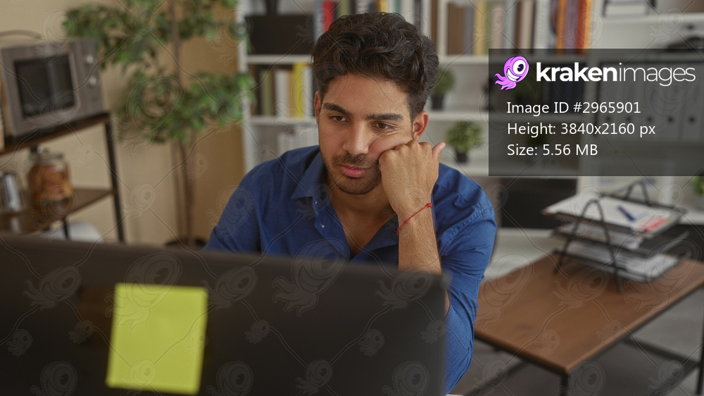 Young hispanic man with hand on chin at computer monitor in building, seated at desk among shelves and potted plants; pensive concentration.