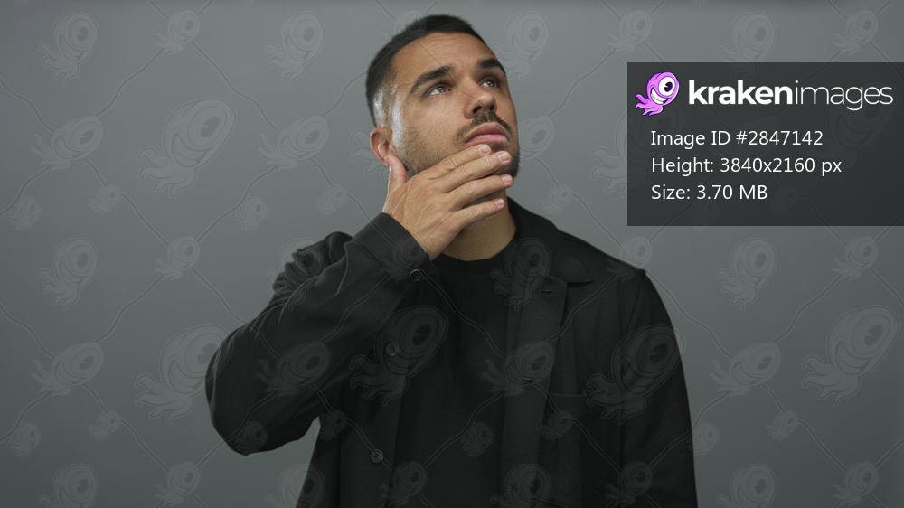 Young hispanic man with hand on chin and head tilted upward in grey studio showing pensive pose; idea reflection.