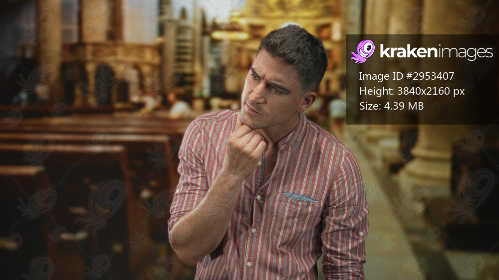 Young hispanic man hand on chin in church nave with striped shirt and wooden pews visible, pensive expression; contemplation thoughtful.