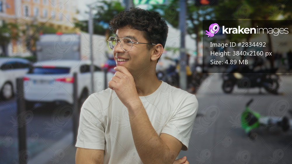 Young hispanic man with hand on chin on a busy city street lined with vehicles and trees looking sideways; quiet contemplation.