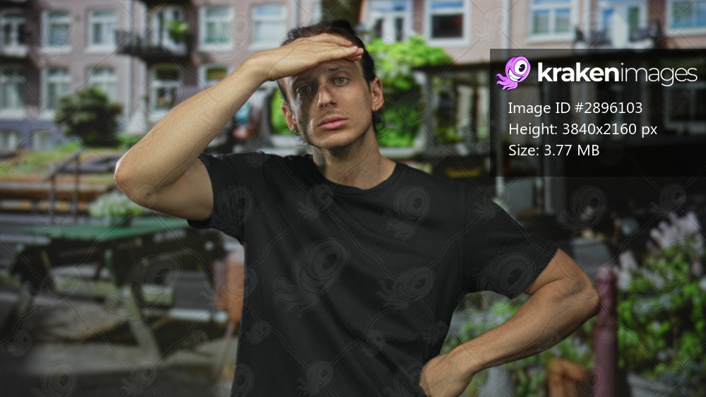 Young hispanic man with hand on forehead shielding eyes on street by amsterdam canal, leaning slightly forward; fatigue city reflection.