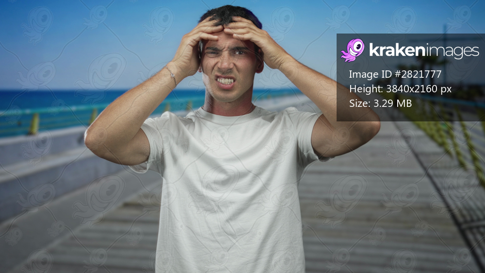 Young hispanic man hand on head for headache on seaside promenade under sunny sky in white tshirt; discomfort.