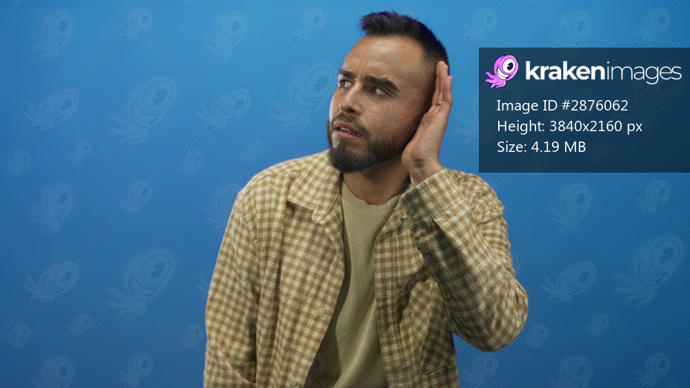 Young hispanic man with hand to ear listening in blue studio, gazing sideways with puzzled expression and slight frown; curiosity focus.