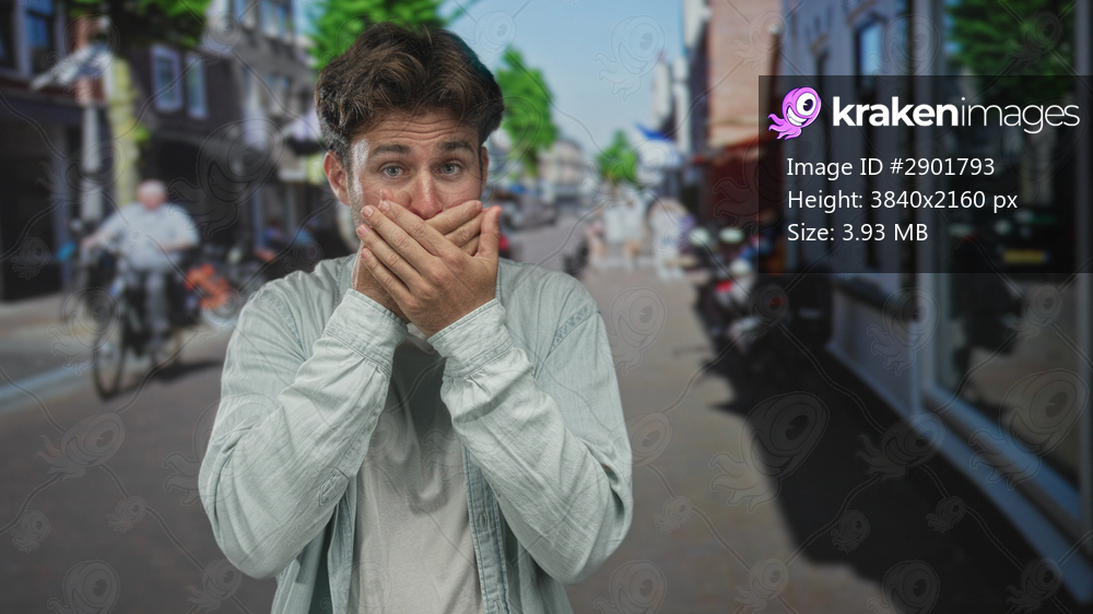 Young hispanic man hands covering mouth on city street with parked bicycles and shopfronts, holding both hands to his face; surprise.
