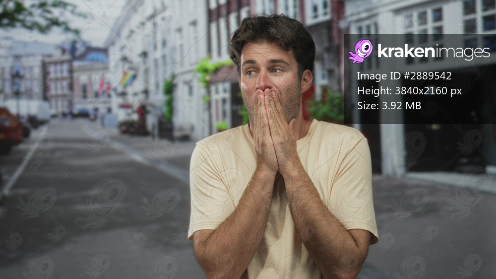 Young hispanic man with hands covering mouth and tense expression standing on a city street lined with buildings and parked cars; surprise.