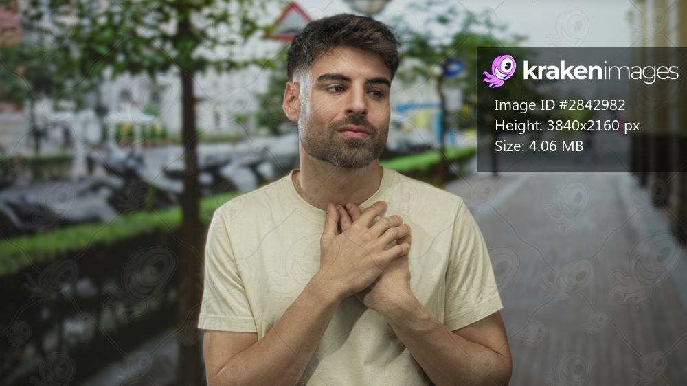 Young hispanic man with hands crossed on chest and eyes gently closed in city street; gratitude sincerity.