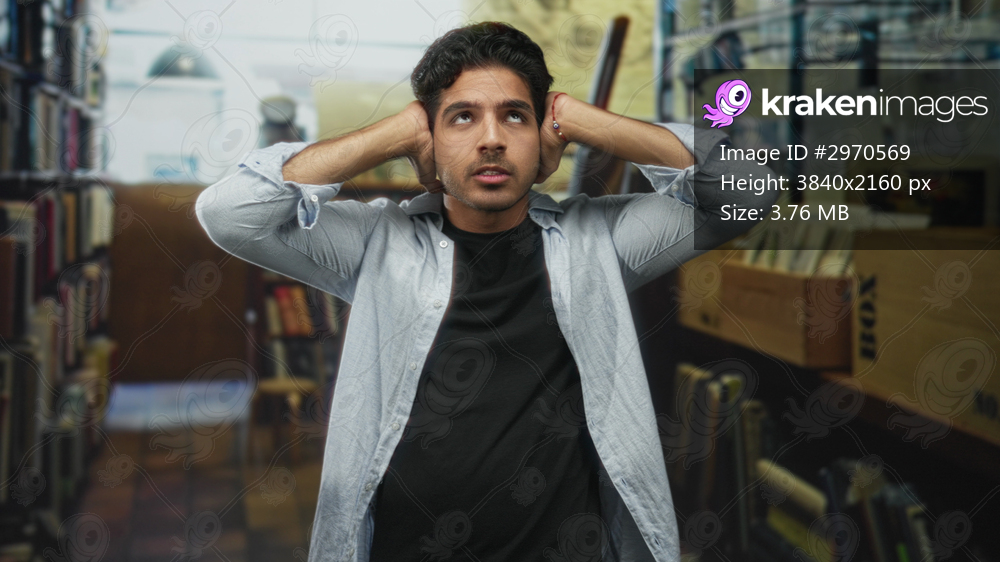 Young hispanic man with hands on head among bookshelves and crates in a bookstore building, looking upward and closing his eyes in thought; contemplation. - Kraken Images