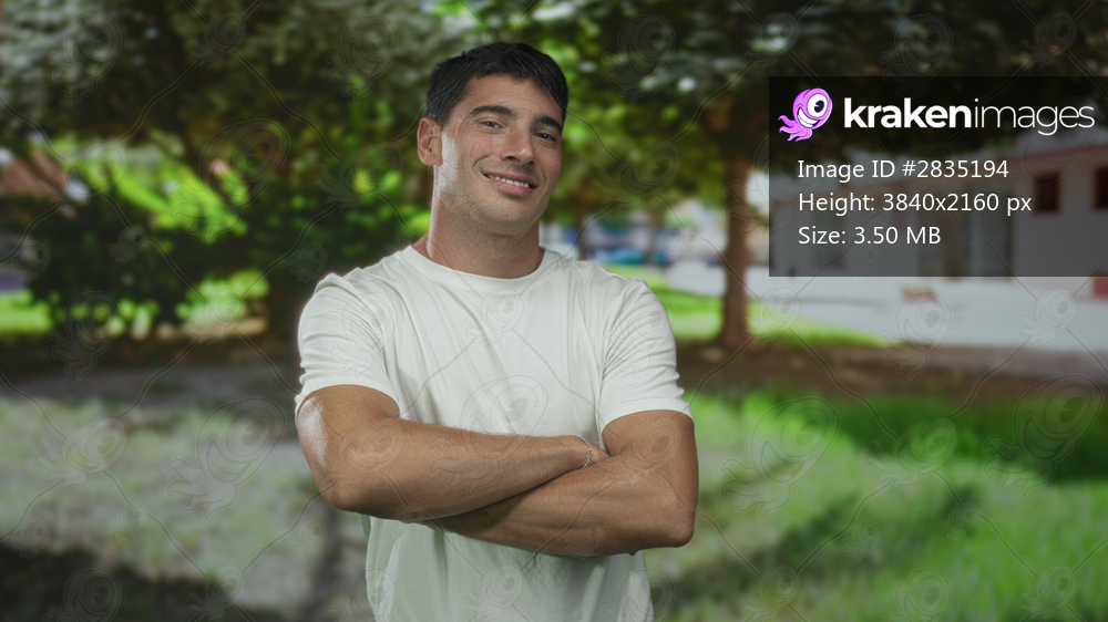 Young hispanic man with hands on hips stands in a sunny green park before a building facade; confidence motivation energy health.