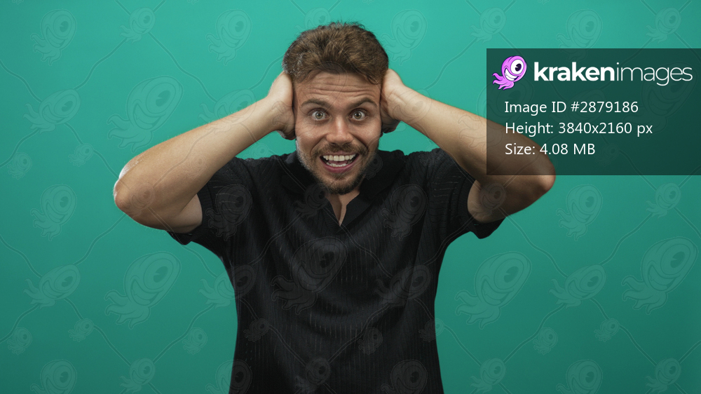 Young hispanic man with hands over ears posed in black polo in teal studio under studio lighting; surprise reaction.