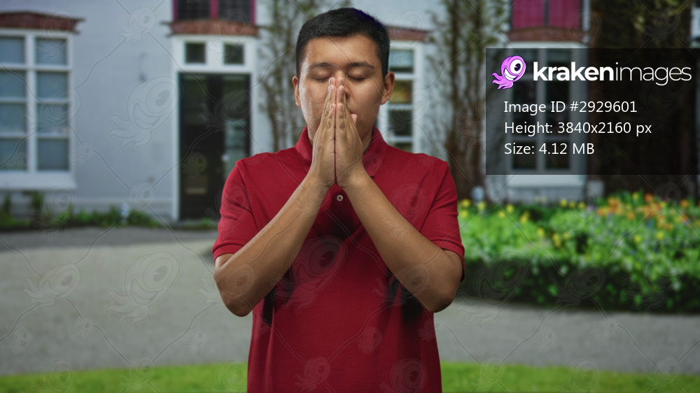 Young hispanic man with hands pressed together in prayer at building entrance outdoors wearing red polo shirt; calm reflection hope.