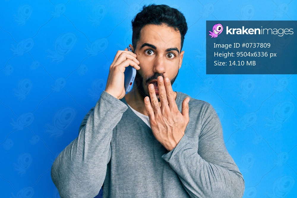 Young hispanic man having conversation talking on the smartphone covering mouth with hand, shocked and afraid for mistake. surprised expression