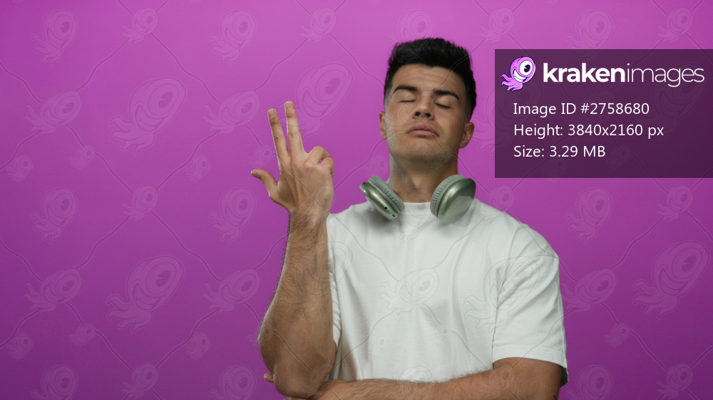 Young hispanic man with headphones making a gun gesture on isolated pink background, wearing a white shirt and displaying an expressive facial emotion. - Kraken Images