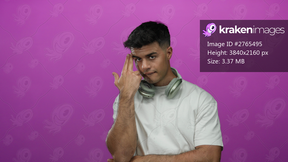 Young hispanic man with headphones making a gun gesture on isolated pink background, wearing a white shirt and displaying an expressive facial emotion. - Kraken Images