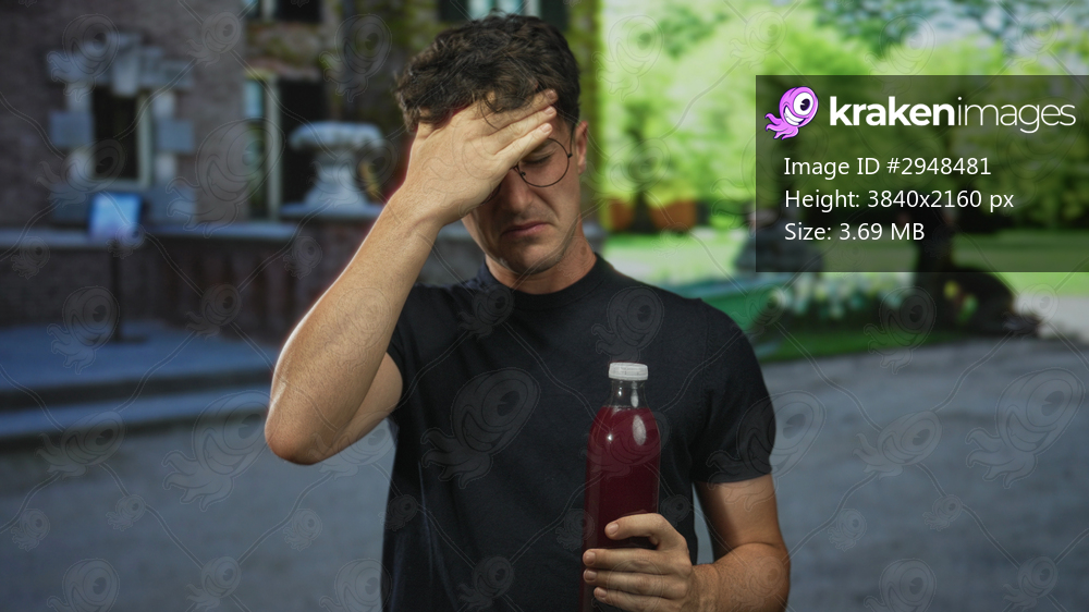Young hispanic man holding a dark bottle of juice with hand on forehead for headache on street beside old building fountain; discomfort.