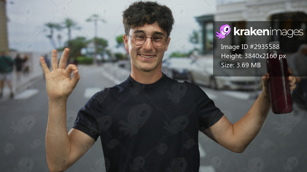 Young hispanic man holding a dark juice bottle and making ok sign on city street, smiling broadly while wearing round glasses; joy wellness.