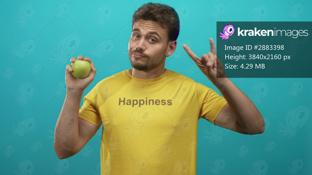 Young hispanic man holding a green apple in his bare hand while making rock horns gesture in a teal studio; playful wellness.