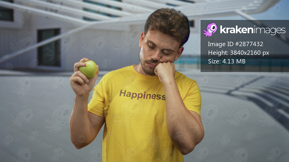 Young hispanic man holding a green apple near his face with hand on chin, wearing yellow t shirt printed happiness at modern building terrace; pensive doubt. - Kraken Images