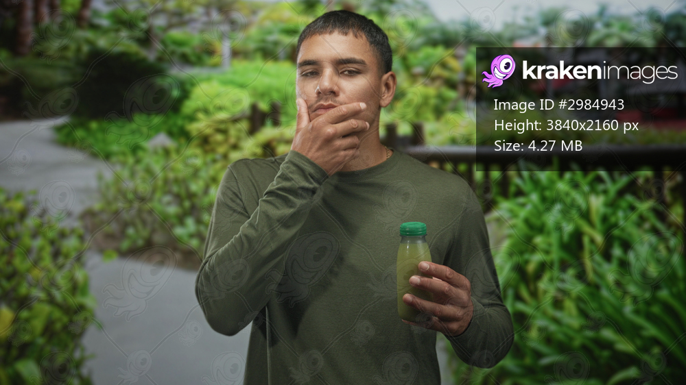 Young hispanic man holding a small green juice bottle covers mouth with hand while tasting and wincing on a forest path lined with tropical plants; disgust hesitation doubt. - Kraken Images