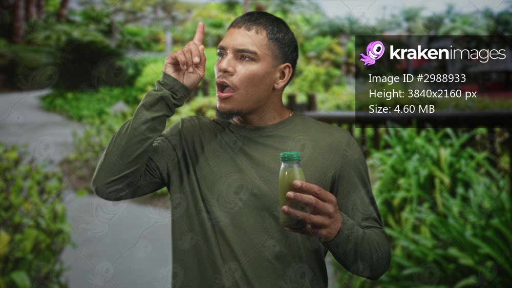 Young hispanic man holding a small green juice bottle covers mouth with hand while tasting and wincing on a forest path lined with tropical plants; disgust hesitation doubt. - Kraken Images