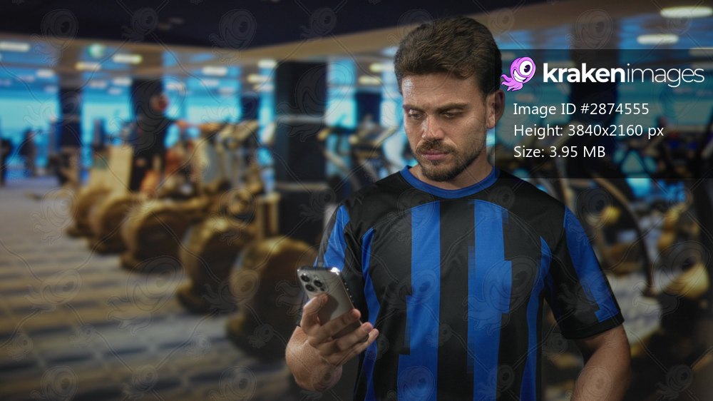 Young hispanic man holding a smartphone, frowning at the screen in a gym building while checking messages; frustration distraction.