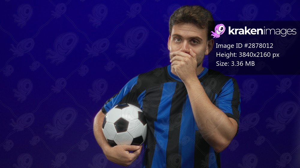 Young hispanic man holding a soccer ball under his arm, hand covering mouth, wearing blue and black striped jersey in a blue studio set; amused hush.