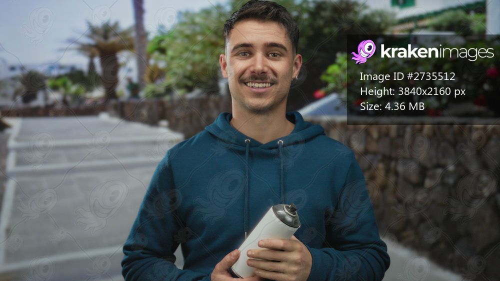 Young hispanic man holding a spray can on a city street, suggesting creative graffiti work in an urban outdoor environment filled with natural greenery. - Kraken Images