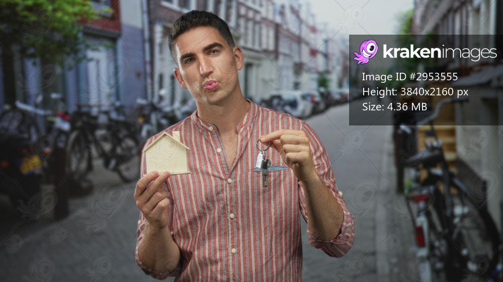 Young hispanic man holding a wooden house model and keys on a busy city street wearing a striped shirt; homeownership joy.