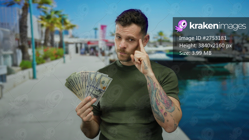 Young hispanic man holding american dollars on a seaside dock with boats in the background, making a thoughtful gesture showcasing wealth and leisure.