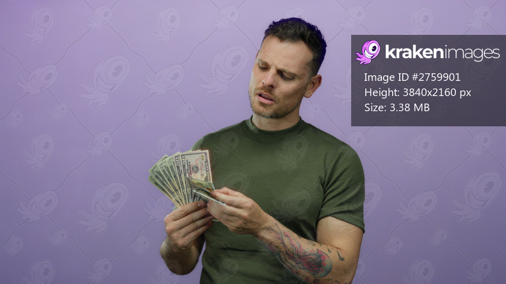 Young hispanic man holding american dollars over isolated purple background looking at money with a satisfied expression