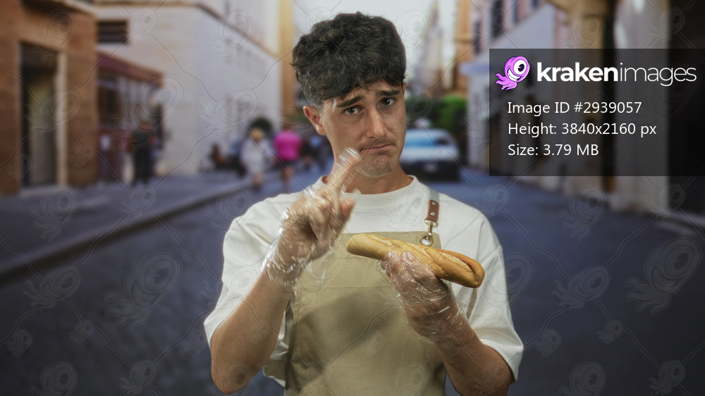 Young hispanic man holding baguette with gloved hand on street in city wearing apron and squinting at bread; confusion concern.