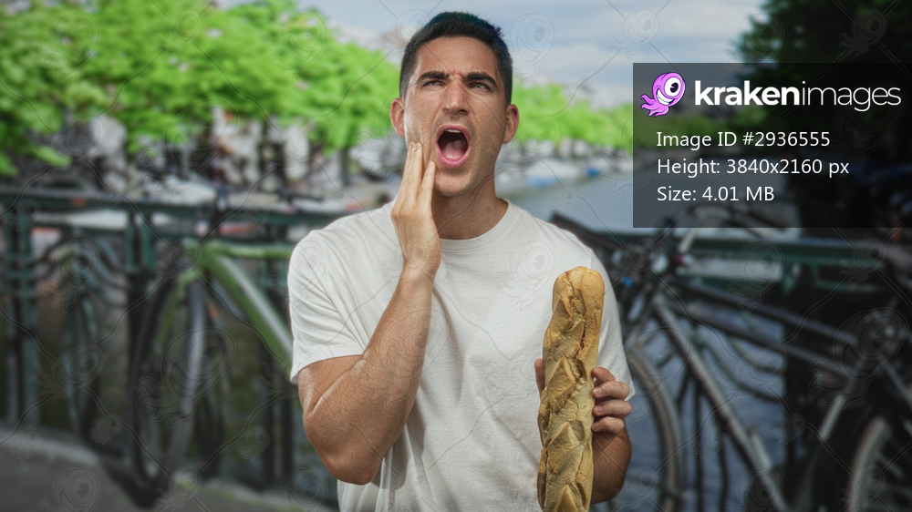 Young hispanic man holding baguette, hand on cheek for toothache, mouth open, wearing white tshirt on street in amsterdam by canal bridge and bicycles; pain. - Kraken Images