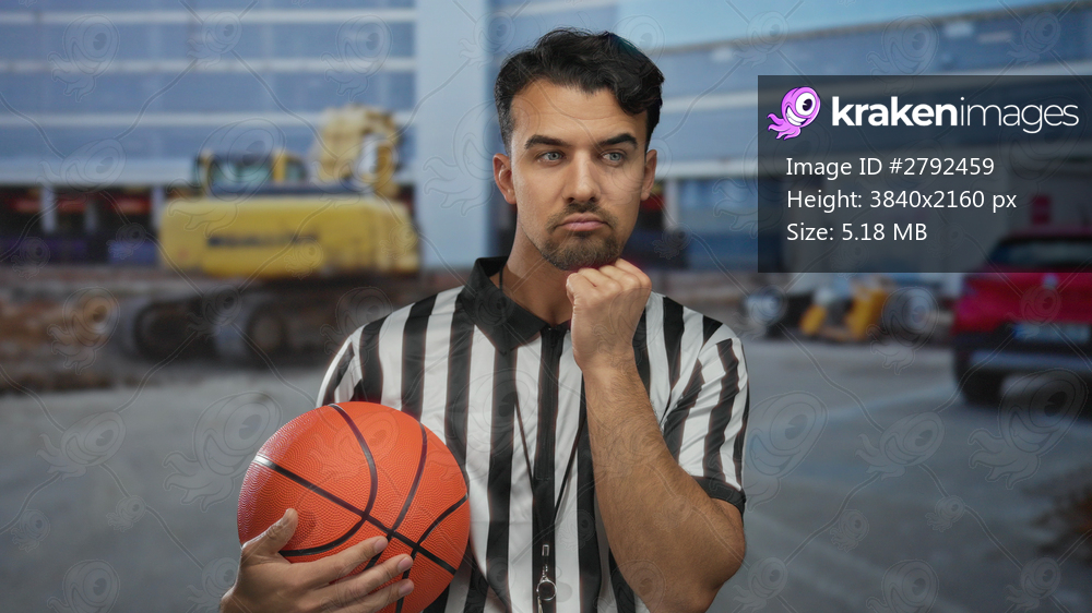 Young hispanic man holding basketball at a construction site in referee outfit pensive expression outdoor setting urban environment