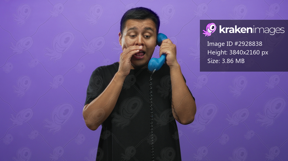 Young hispanic man holding blue telephone handset, covering mouth while talking in purple studio; playful connection.