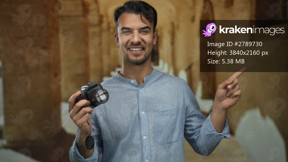 Young hispanic man holding camera pointing in outdoor university setting with a smile.