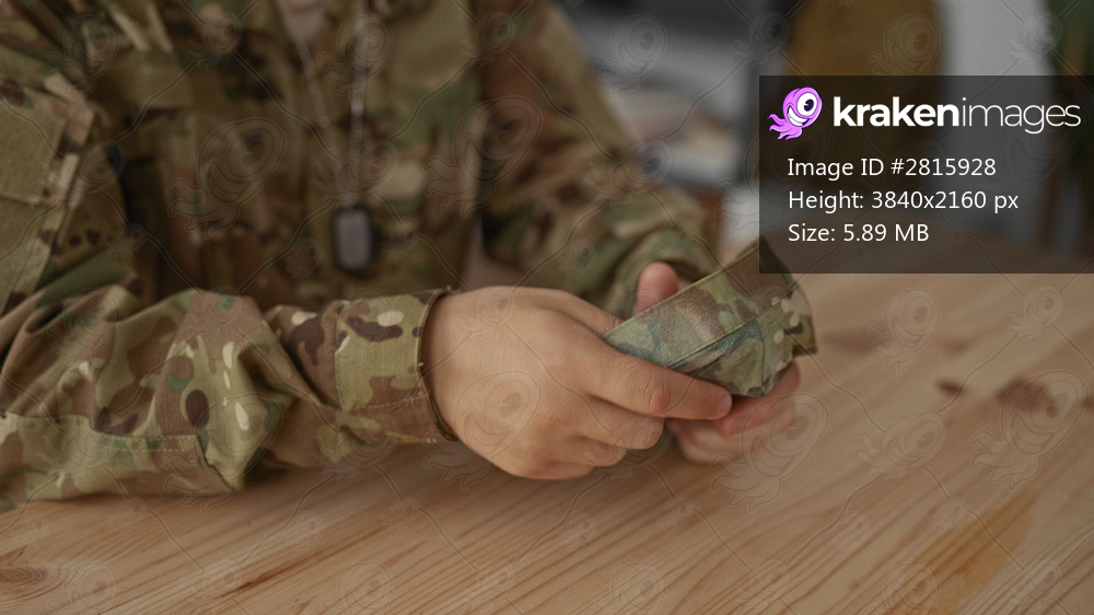 Young hispanic man holding camouflage cap and dog tag necklace on wooden table in building interior; duty.
