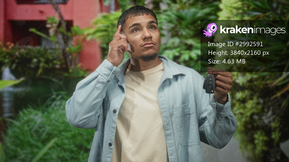 Young hispanic man holding car keys and touching chin near a fountain and lush plants in a building courtyard; thoughtful decision.
