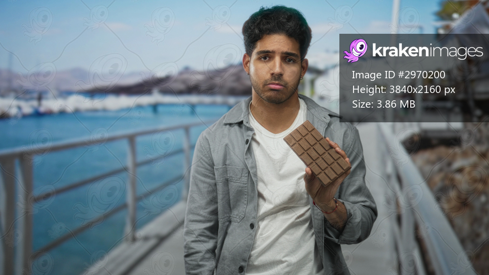 Young hispanic man holding chocolate bar in an open palm with lips pouting while inspecting it on a street waterfront; disappointment.
