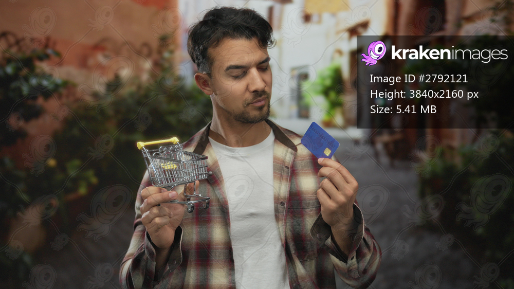 Young hispanic man holding credit card and shopping cart on city street suggests urban consumer lifestyle outdoors.