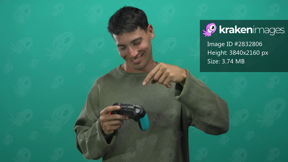 Young hispanic man holding cyan and black game controller smiles and points finger in green studio; playfulness fun excitement energy.