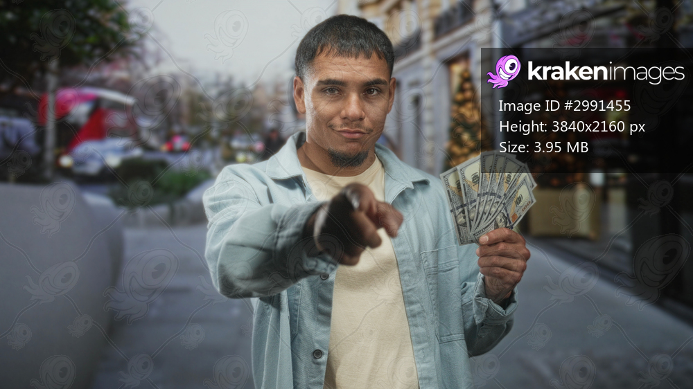 Young hispanic man holding fanned dollars and pointing finger toward camera on a busy city shopping street with holiday shopfronts; confidence success. - Kraken Images