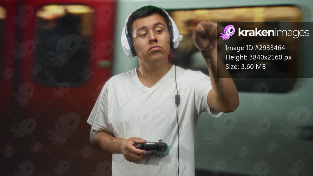 Young hispanic man holding game controller and wearing headset, hand raised while adjusting earpiece in station building; commute gaming focus.