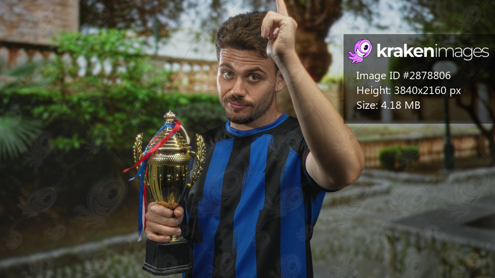 Young hispanic man holding gold trophy and pointing finger to camera in street courtyard with stone balustrade and trees; confidence.
