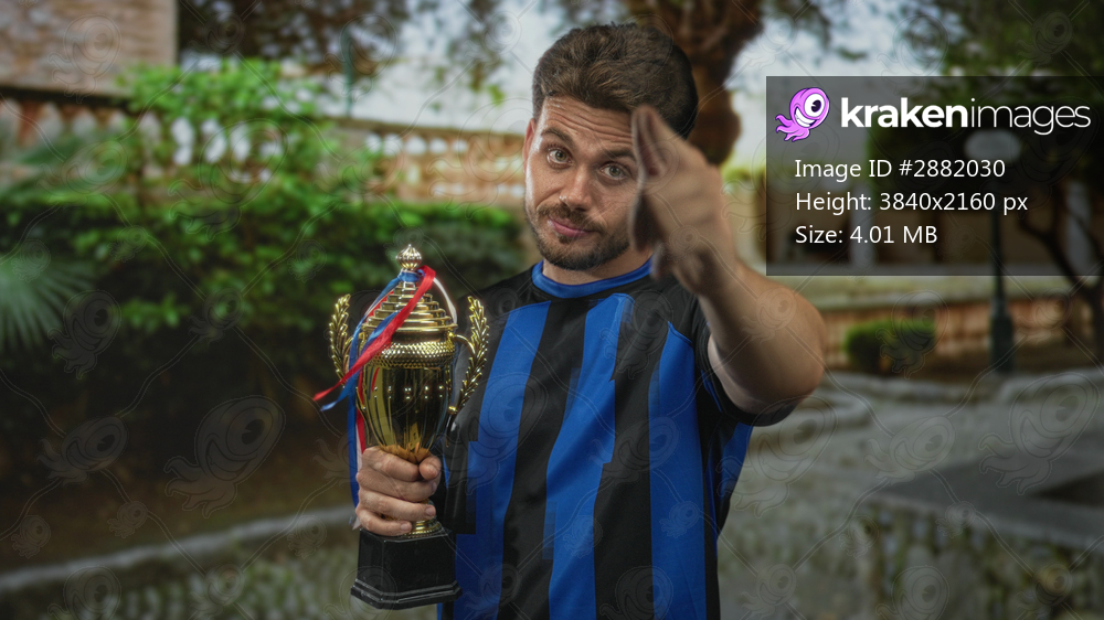 Young hispanic man holding gold trophy and pointing finger to camera in street courtyard with stone balustrade and trees; confidence.