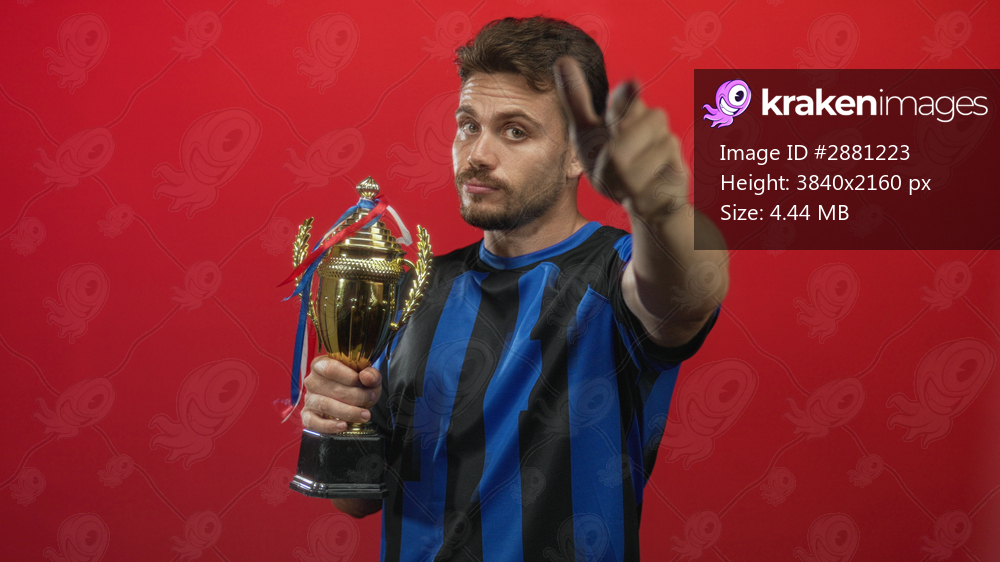Young hispanic man holding gold trophy and pointing index finger in red studio; pride celebration victory.
