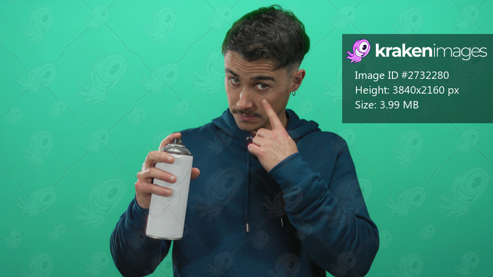 Young hispanic man holding graffiti bottle gesturing at his eye over isolated green background wall, conveying a creative concept urban vibe with focus on street art culture - Kraken Images