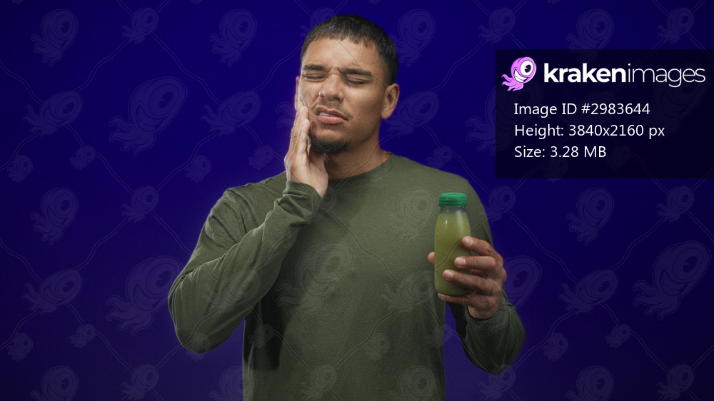 Young hispanic man holding green juice bottle, hand on cheek wincing after sip, posed against purple backdrop in studio; pain hesitation.
