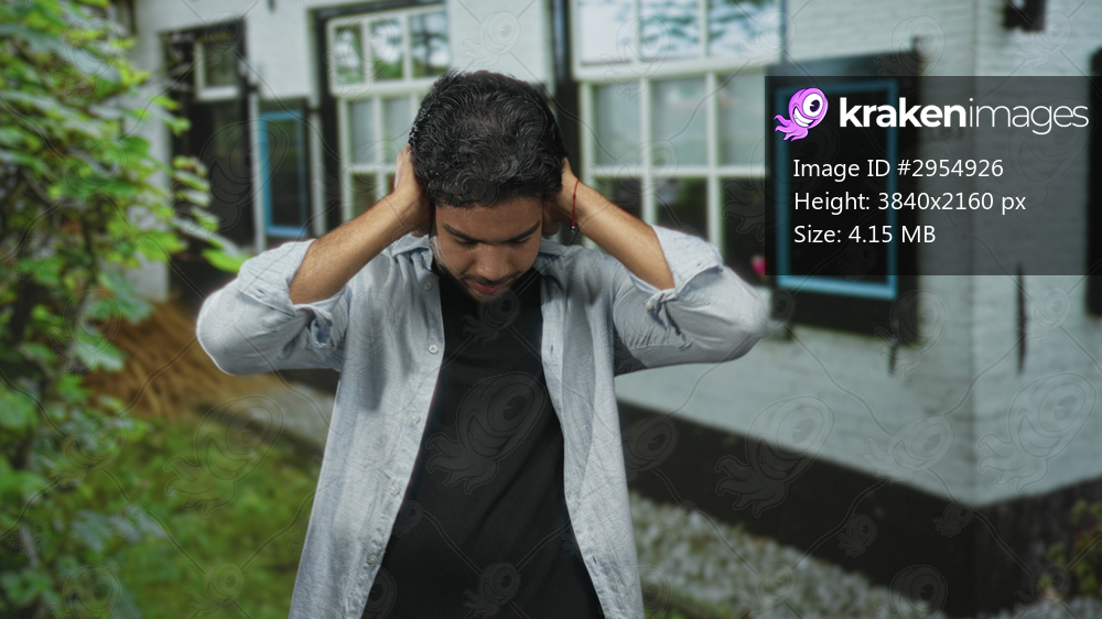 Young hispanic man holding hands behind neck outside a white building with shuttered windows and garden path, wearing open shirt over black tee; introspection solitude. - Kraken Images