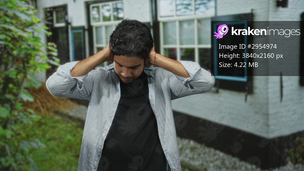 Young hispanic man holding hands behind neck outside a white building with shuttered windows and garden path, wearing open shirt over black tee; introspection solitude. - Kraken Images