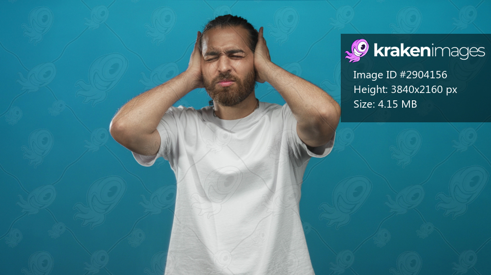 Young hispanic man holding hands to ears and grimacing in studio with teal blue background wearing white t shirt; sensory overload distress.