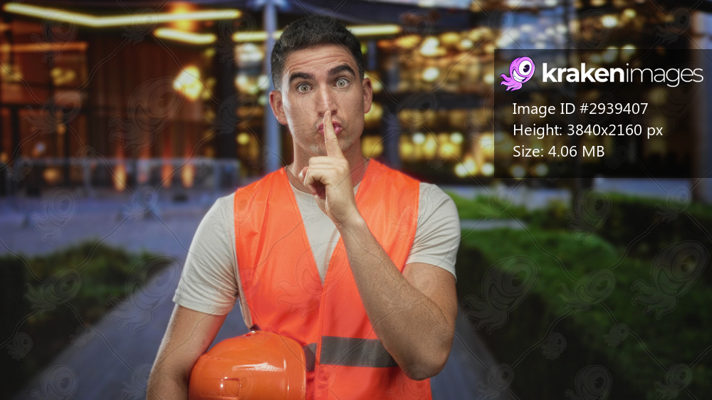Young hispanic man holding hardhat in orange vest finger to lips for silence in front of building; safety quiet.